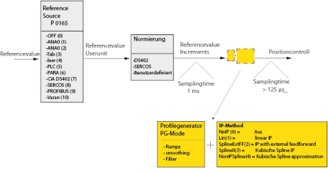 - The position references are used to generate pre-control values for speed and acceleration. These are scanned at the sampling time of the position controller (normally 125 µs) and switched to the control loops.