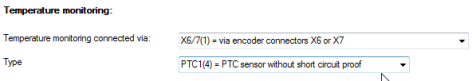 The device can evaluate different temperature sensors. With P 0732 MON_MotorPTC the sensor fitted in the motor and the wiring variant are set (sensor cable routed in resolver or separate). In an evaluation via KTY, the shut-off threshold of the motor temperature can additionally be set.
