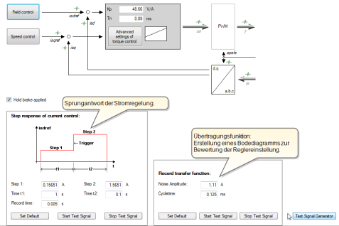 To determine the transfer function the noise amplitude (motor rated current) and the sampling time (default 0.125 ms) must be specified. Click the "Start Test Signal" button.
