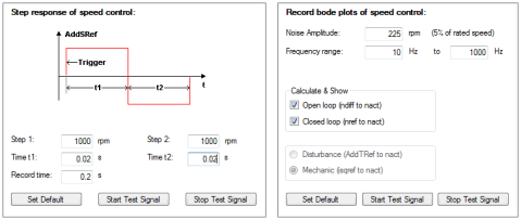 To determine the transfer function the noise amplitude (motor rated current) and the sampling time (default 0.125 ms) must be specified. Click the "Start Test Signal" button.