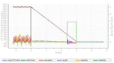 In the event of a wire break on the encoder system the drive is shut down in sensorless mode on the preset quick-stop ramp. Due to the lack of dynamism at low speeds, the sensorless control is very "imprecise". To enable the drive nevertheless to be run down smoothly to speed 0, as from the speed threshold parameterized in P 0355(0) the controller switches to a current/frequency (IF) control. For stabilization, an additional parameterizable d-current must be injected via P 0355(1). The speed controller gain is reduced by the factor P 0355(2).